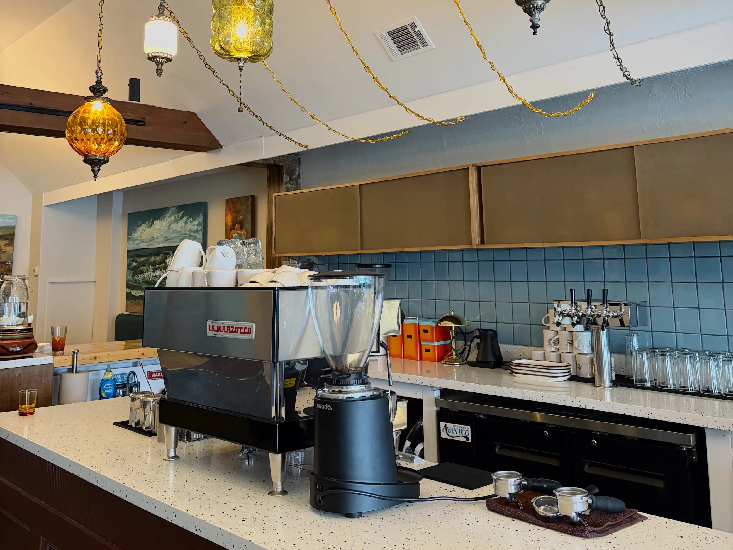 “Everything is used or handmade,” Josh commented. The bar and countertops he made himself, while the light fixtures used to belong to a church, and the vintage blue tile backsplash was locally thrifted. The space is already filled with memories, and it’s their goal to fill it with even more.